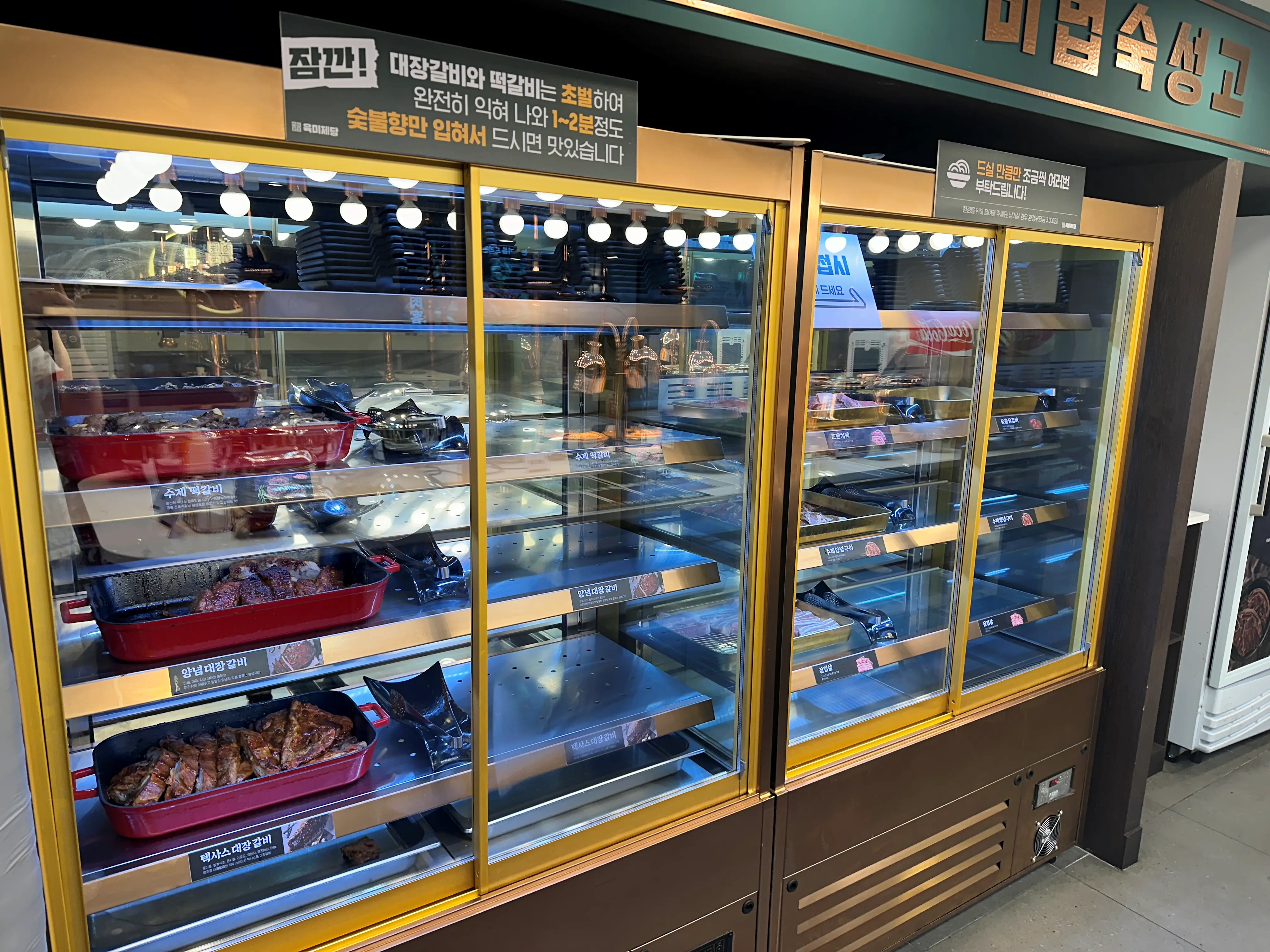 왼쪽에 있는 냉장고에는 육미제당의 간판인 대장갈비 두 종류와 수제 떡갈비가 있습니다.