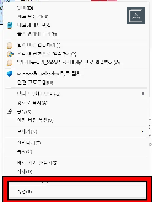 먼저 파일을 우클릭해서 속성 창으로 진입합니다.