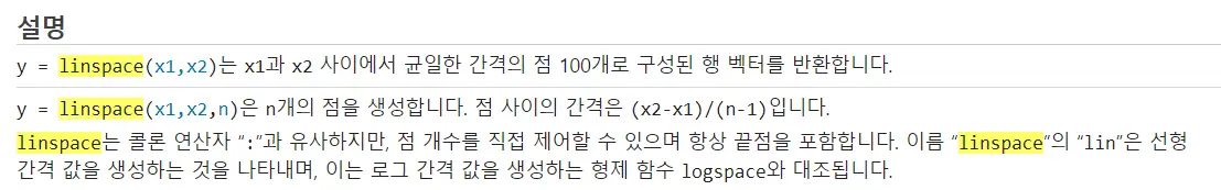 점과 점사이의 일정한 간격을 가진 배열을 만들때 사용하는 함수는 linspace가 되겠습니다.